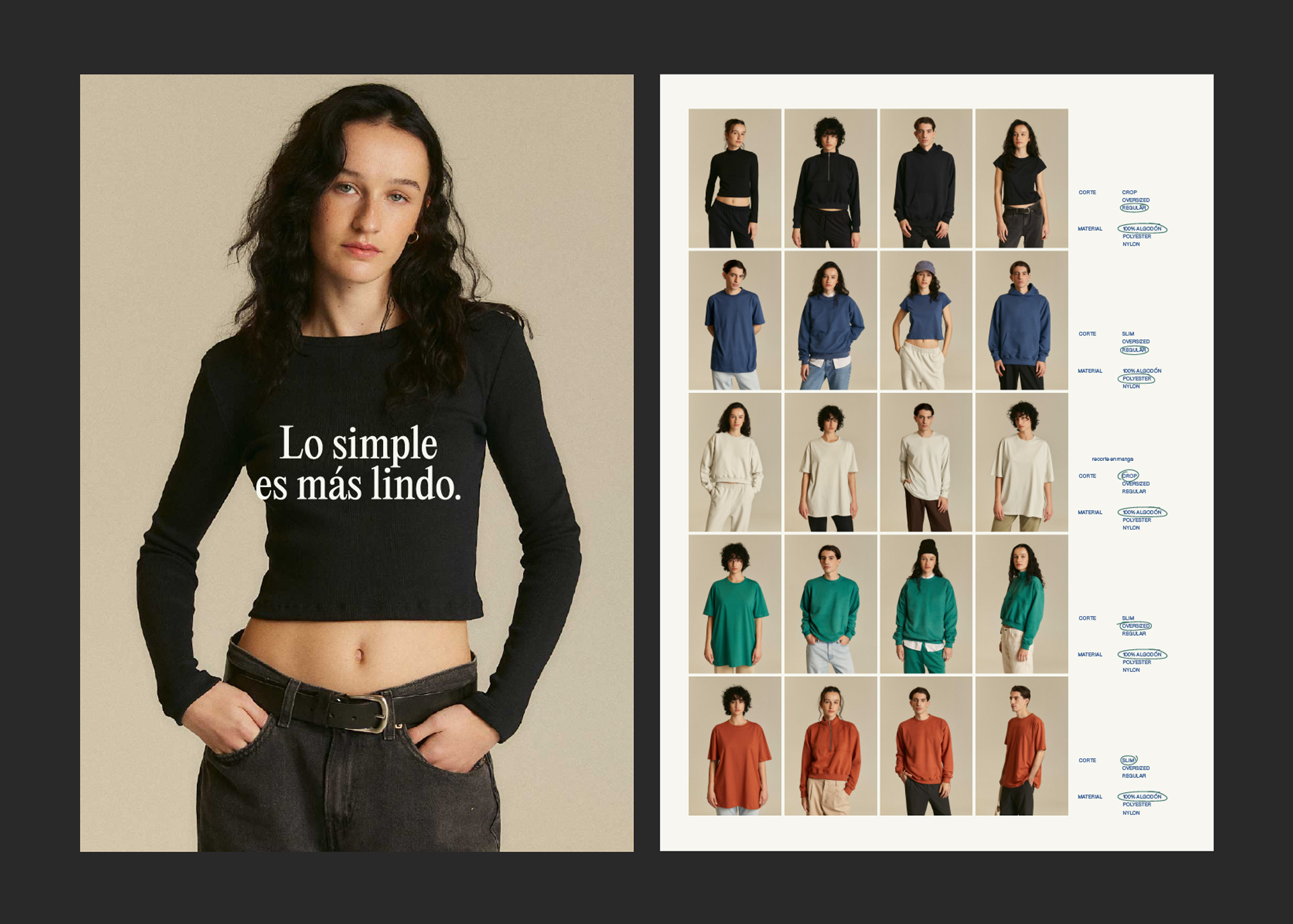 (ES) Diseño de identidad visual. Diseño y estrategia de comunicación en redes sociales. Diseño de packaging. Diseño de piezas para web, email marketing y pauta en redes sociales. Diseño de estampas, etiquetas y avíos. Diseño web (con ecommerce). Desarrollo creativo de campañas audiovisuales editoriales. (EN) Visual identity design. Social media design and communication strategy. Packaging design. Design of web, email marketing, and social media advertising assets. Design of prints, labels, and trims. Web design (with e-commerce). Creative development of editorial audiovisual campaigns.