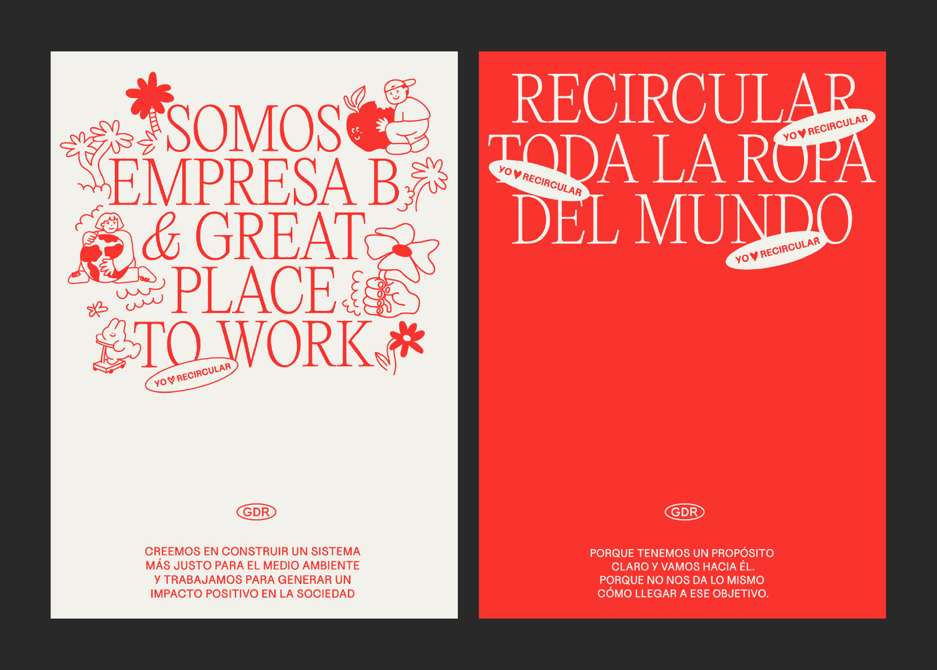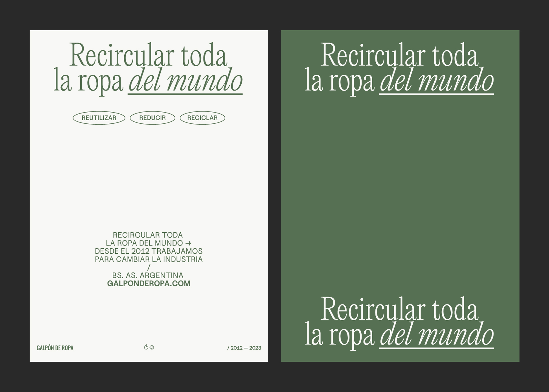 (ES) Diseño, dirección y producción. Estas campañas se realizaron para comunicar la marca verde de Galpón De Ropa incluyendo sus programas de reciclaje, donaciones y compomiso social. (EN) Design, direction, and production. These campaigns were created to communicate Galpón De Ropa’s green brand, including its recycling programs, donations, and social commitment.